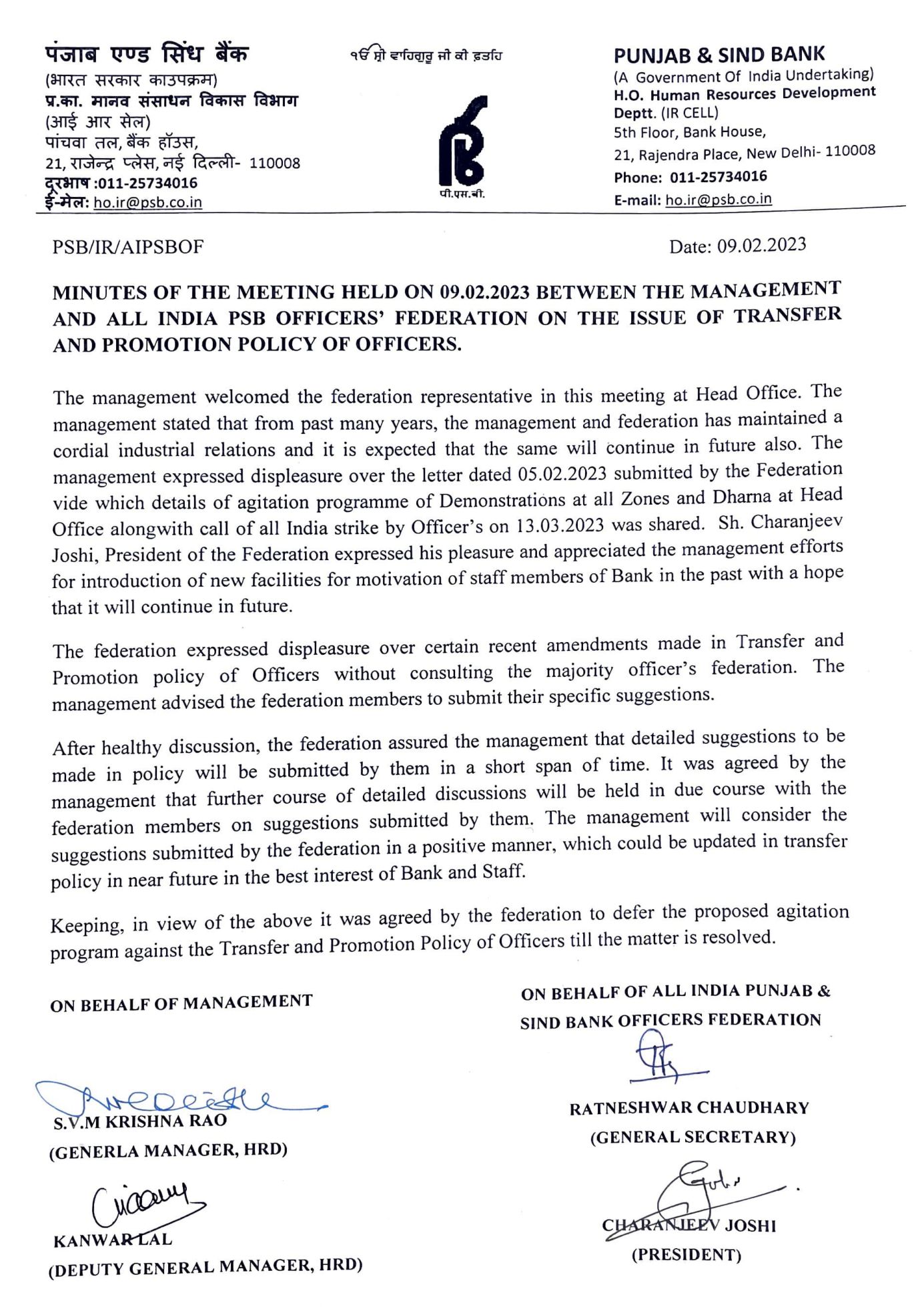 2. The strike scheduled on 20th May 2025 was postponed to 09.07.2025 by the unions including in the financial sector. There are issues confronting the entire workforce in the Industry VIZ: Disinvestment of Government Equity in IDBI, 5 Public Sector Banks, Issuance of IPO’s in RRBs, Recruitments in all cadres, work-life balance in the current environment, 5 days banking, outsourcing the permanent jobs of officers, up-dation of Pension, PLI- enhancement akin to executives/board level appointees, Grade Pay to the Officers akin to SBI etc. Our organization deferred the strike based on the assurances by Government representative present in the conciliation proceedings held at New Delhi on 18th and 21st March 2025.